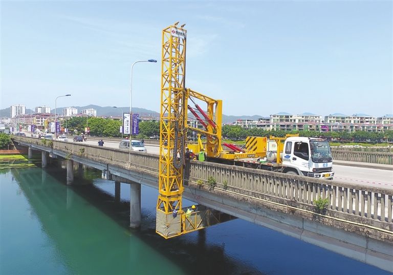 将桥梁检测车开到桥面上,经过伸展出的支架,工作人员爬上工作平台,然后缓缓降到桥面下,对桥梁进行检测。这种检测办法动辄就要占用几股车道,查看速度慢,工人的也面临风险。